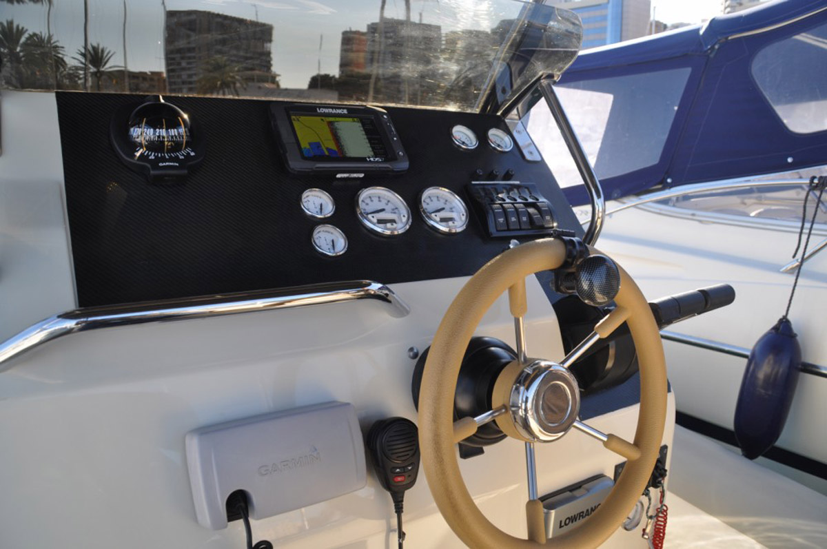 Equipada con GPS, VHF y sonda, posee dos motores foraborda de 200hp por motor, velocidad maxima 38.6 nudos, dispone de sistema de audio fusion y una nevera portatil, WC a bordo, dos zonas de solarium y toldo en popa.